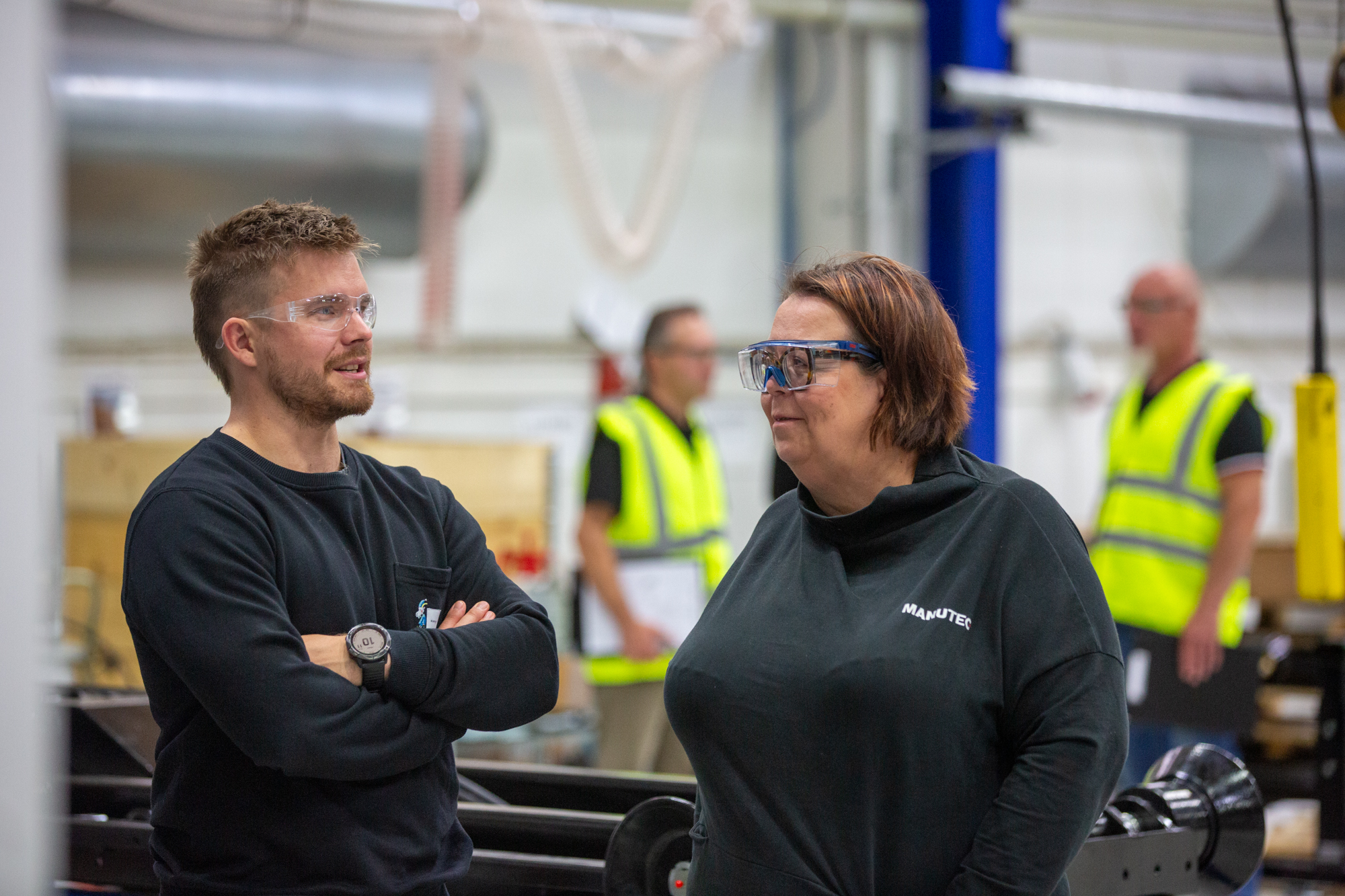Manutecin toimitusjohtaja Kirsi Junnilainen kertoo sopimusvalmistuksen työvaiheista Cargotecin Jussi Railolle.